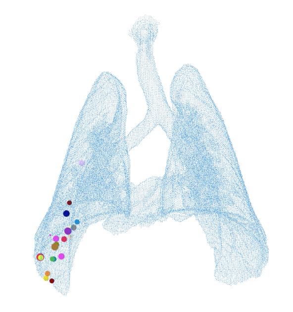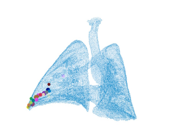 located in 3D space wherein each circle of a single color represents a granuloma with